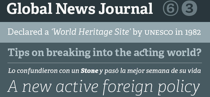 The intermediate weights deliver a very legible and neutral look when used in text sizes, providing the usual robustness expected in a newspaper font. The unobstrusive appearance, excellent texture and slightly dark color allow it to behave flawlessly in continuous text setting, even in the most demanding editorial applications.