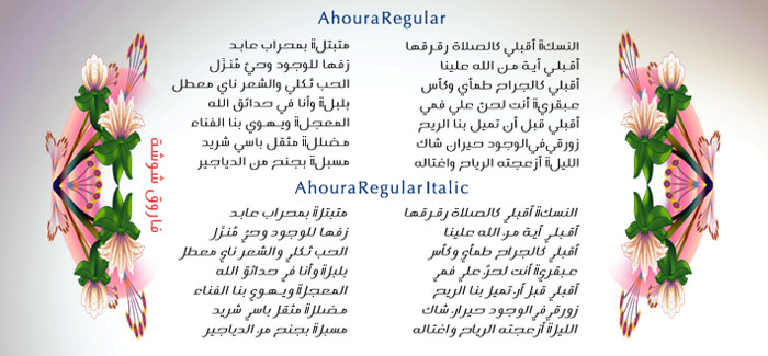 Ahoura is the first real italic Arabic typeface known until now and its intuitive design arrangement fulfils the following needs: