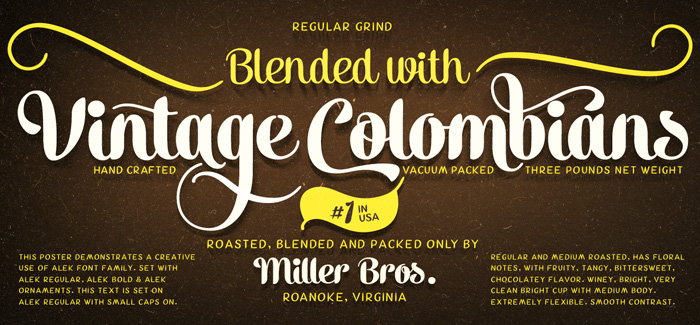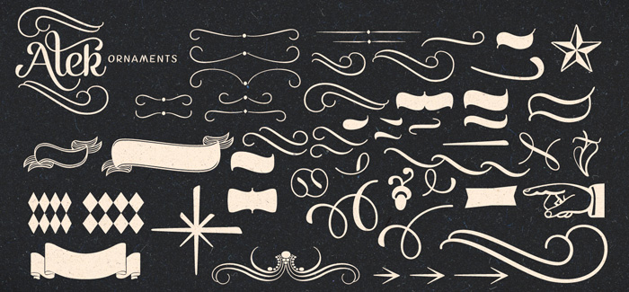 Combine Alek with Alek Ornaments to complete your designs. Turn on SmallCaps and write in lowercase to activate a set of block letters designed to support Alek.