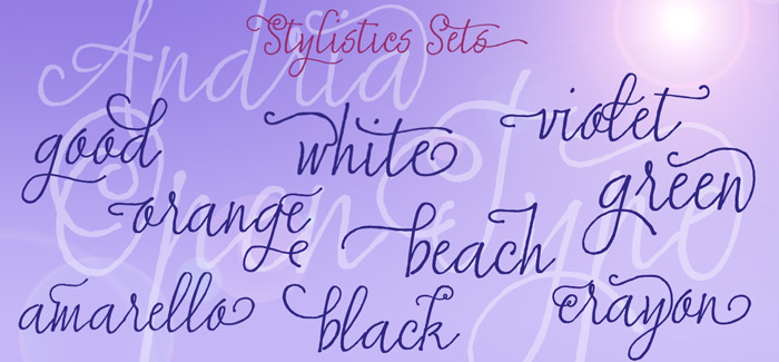 Andria font is an original script designed by Eurotypo (Aleka, Kumma, Ameglia). This single weight face is a good example of how natural handwriting imperfactions are turned into haunted effect adding more authenticity to every design. Andria has a lot of potential to show if used in greeting cards, packaging, book covers or artistic headlines. It’s developed with extended character set supporting multilingual diacritics, alternates, swashes and ligature – they will all work in OpenType-aware soft. Andria is a low contrast face and will work perfectly in most of the cases both for screen and print graphics.