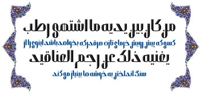 Bamdad Extra Bold Condensed font is designed by Naghi Naghashian. This headline font is developed on the basis of specific research and analysis on Arabic characters and definition of their structure. This innovation is a contribution to modernisation of Arabic typography, gives the font design of Arabic letters real typographic arrangement and provides more typographic flexibility. This step was necessary after more than two hundred years of relative stagnation in Arabic font design.