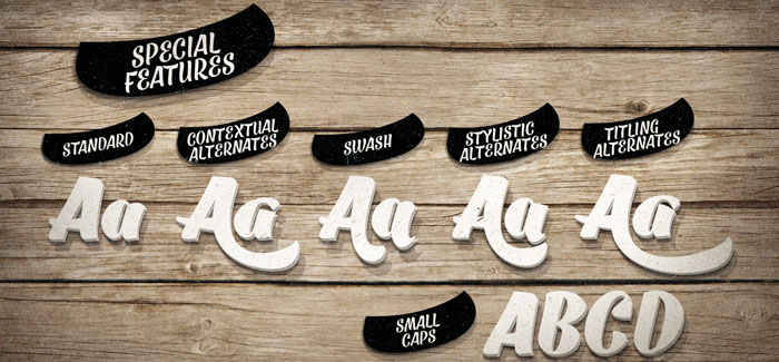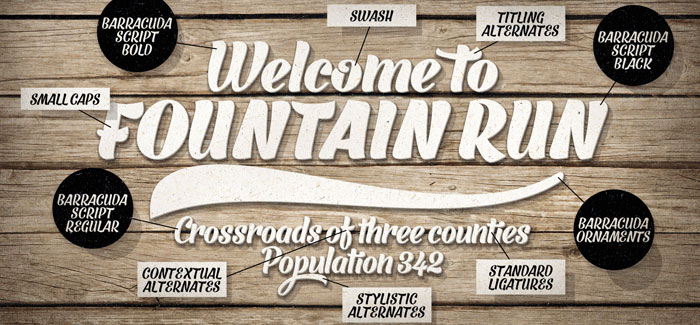 Barracuda Script font is a bold and vibrant brush family of three weights and matching ornament sets. Barracuda Script is packed with alternate characters, each basic letter has at least four variants to allow you create customized headlines. To activate the alternates click on Swash, Contextual, Stylistic or Titling Alternates in any OpenType savvy program or manually select the characters from Glyph Palette. Turn on Small Caps to access a complete set of capital letters designed for writing in all caps.
