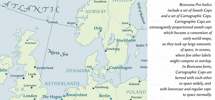 Beorcana Italics include a set of Swash Caps and a set of Cartographic Caps. Cartographic Caps are extravagantly proportioned swash caps which became a convention of early world maps, as they took up large amounts of space, in oceans, where few other labels might compete or overlap. In Beorcana fonts, Cartographic Caps are kerned with each other to space widely, and with lowercase and regular caps to space normally.