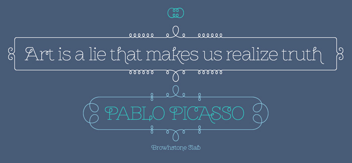 Designed in 2013 by Ale Paul/Sudtipos, Brownstone Slab font is an evolutional slab serif and decorative version of the original award-winning Brownstone Sans. Inheriting the clean outlines of its predecessor Brownstone Slab is a contemporary response to the Victorian motifs of ironwork and carved decorations traditional for New York City row houses. Brownstone Slab looks a little more solid than the original Brownstone Sans yet very elegant and eye-catching. It is developed in three weights supporting an impressive set of alternates, swashes and beautifully designed “Ale”-style ligatures. Moreover – you’ll be surprised to find 3 separate fonts with stylish frames and ornaments – one for each of Brownstone Slab’s weights. If you like using an abundance of open type features, then this is it – the Brownstone Slab font family by Ale Paul.