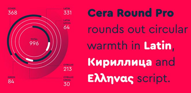 Cera Round Pro family consists of six fonts – Thin, Light, Regular, Medium, Bold and Black. As you might expect, every weight has its purpose. Regular is an exceptional tool for longer texts. The light weights with their precision and plainness are perfect for more technical tasks, whereas the soft and lively heavy weights are great for headlines. Cera Round Pro provides support for Latin, Cyrillic and Greek with localized alternatives and, as required by the modern age typography, a bunch of very useful extras like arbitrary fractions, symbols, dingbats and tabular figures.