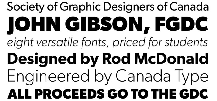 The Gibson family is available through Canada Type and its popular distributors. All the revenues from its sale will be donated by Canada Type to the GDC, where they will be allocated to a variety of programs aiming to improve the creative arts and elevate design education in Canada.