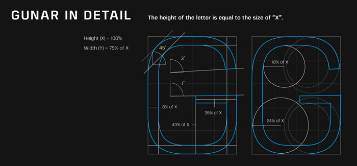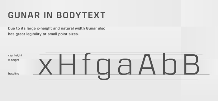 Gunar font by Jonathan Hill is a geometric sans serif with a square chiseled appearance. Precise curves are met with straight lines and tapered angles to produce a fresh, technical typeface. It’s large x-height and neutral width give it good legibility at small point sizes. These refined rectangular features make it ideally suited to a wide range of modern applications. Details include 550 characters with alternative lowercase a, e, g and y. 5 variations of numerals, manually edited kerning and Opentype features.