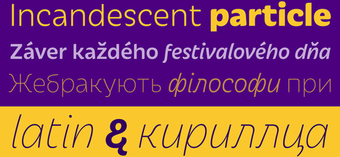 Sporting a low-contrast profile, it is a study of bridled energy in the Cyrillic and Latin scripts. Its eye-catching forms are an oblique tribute to the less-predictable style of brush lettering, and contain daring, elegant curves, economical proportions, and a slight top-heavy asymmetry. Its warmth comes from the subtle emphasis on the structures and details of individual letterforms, whereas its solidity is demonstrated through its balanced rhythm over long spans of text.