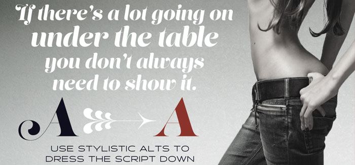 Lust Script font is packed with alternates to play with… enough to turn you on and satisfy. Utilizing the OpenType features (and Glyph palette) wisely will have you weaving through endless variations of Stylistic, Contextual, Titling, Historical and Swash alternates.