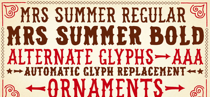 Mrs Summer font is a hand drawn narrow typeface with a Western touch. It has only uppercase characters with alternate glyphs in place of lowercase letters and additional alternate glyph in a Stylistic Set. It has build in OpenType Contextual Alternates feature that will automatically set alternate glyphs depending on frequency of appearance of the same character (even in web font but only in HTML5 browsers). The script doesn’t just throw random glyphs.