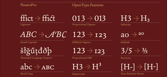 Pesaro font family comes in OpenType format with extended language support. All weights contain ligatures, proportional lining figures, tabular lining figures, proportional old style figures, lining old style figures, matching currency symbols, fraction- and scientific numerals and elegant swash capitals for all italic styles.