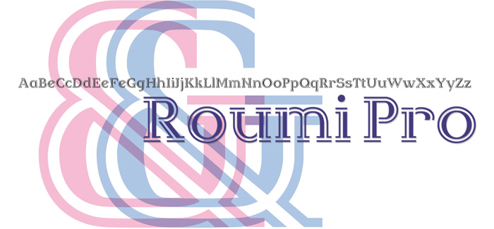 Roumi Pro font is designed by Naghi Naghashian. It is a headline font, as modern interpretation of classic Roman characters in 1 weight: Regular. The naming is driven from the name of Rumi (the Roman), Persian philosopher and poet, 1207-1273.