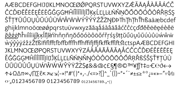 The light and normal weights and the dominant x-height with its high ascenders make for easy reading of long copy. The heavy and x-light weights are excellent for exquisite headings.