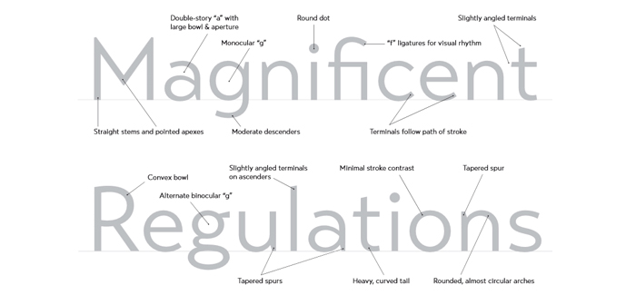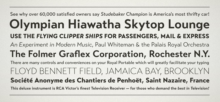 Transat Text includes many OpenType features, such as ligatures, small capitals, case sensitive forms, stylistic alternates, arbitrary fractions, and a full complement of proportional, tabular, and oldstyle figures.