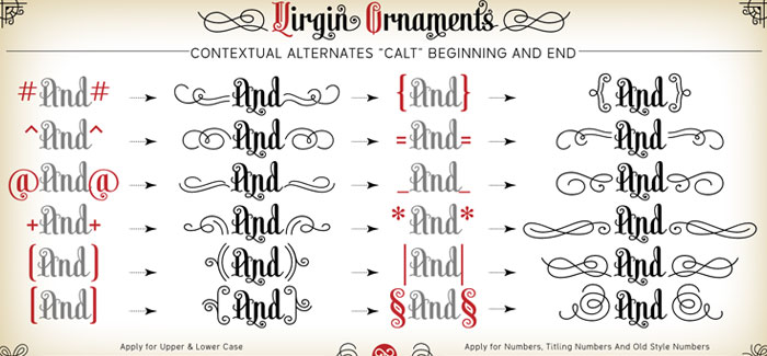 Virgin font is a hybrid typeface with a Victorian spirit, based on script forms of Romanesque ornamentation. With his rich variety of stylistic forms, ornaments and catchwords, Virgin is a chance to create completely new texts, varied and elegant. About 1100 Glyphs allow users to create words out standard, thanks to its Opentype programming in countless combination of alternates. The variety of styles makes it easy to create texts according to your taste and use because Virgin offer an unlimited combinations of stylistics alternates. Virgin is ideal for humanistic texts, tourist ads, liquor and wine labels, fashion and even for cosmetic purposes. Virgin is presented in solid and inline version, and a basic version for web in lighter weight, also providing a refined collection or ornaments and catch Words. Virgin has been specially designed for logotype, packaging & publishing design project. Virgin evokes the richness of nature in its biodiversity.