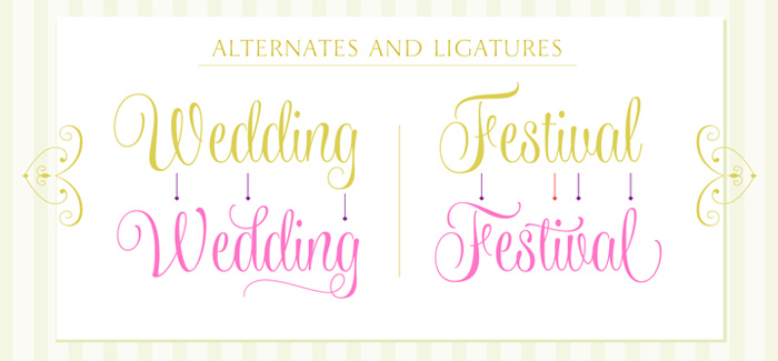 Wishes Script font is OpenType programmed typeface offering a wide spectrum of graphic design tools: frames, ribbons, hearts, flowers, ornaments, swashes, endings, ligatures, and all the alternates you need to create eye-catching designs. Blending English style with lettering through delicate and flowing curves the Script works perfectly in greeting cards, invitations, weddings, posters, magazines, fashion world, logos, packaging, etc.